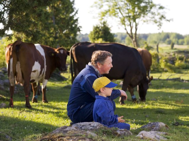 Bonde med barnbarn tittar på kor. Foto: Hans Bjurling, Scandinav