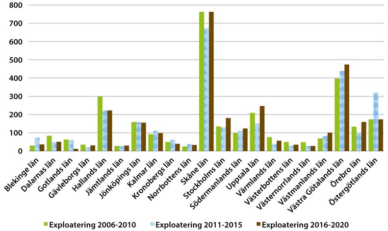 Under perioden 2016 – 2020 exploaterades i Sverige drygt 3 000 hektar jordbruksmark, vilket motsvarar ungefär 6 000 fotbollsplaner. Det är i samma storleksordning som de två föregående femårsperioderna. Byggande av bostäder är den främsta orsaken till att jordbruksmark exploateras.
