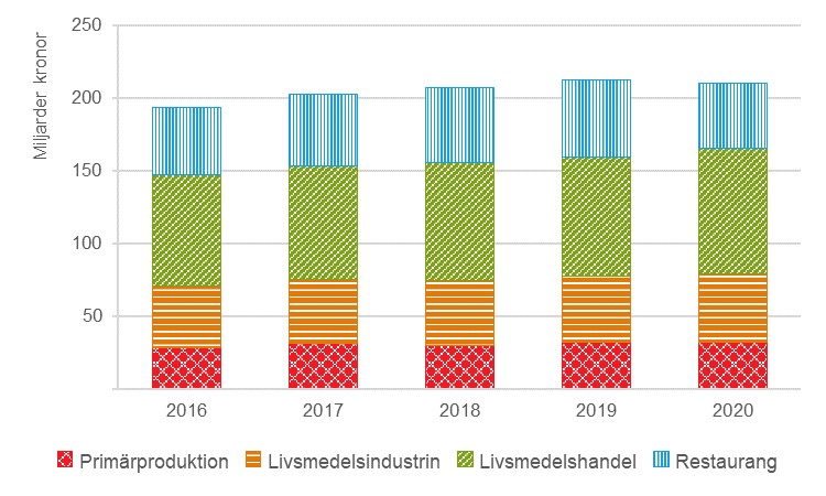 Produktionen i livsmedelskedjan har följts upp genom att studera förädlingsvärdet (som förenklat visar värdet på produktionen minus värdet på använda insatsvaror) hos företagen i livsmedelskedjan. Det totala förädlingsvärdet i livsmedelskedjan uppgick till drygt 210 miljarder kronor år 2020, vilket var en ökning jämfört med år 2016. Utvecklingen har även analyserats med en regressionsmodell för att få en bättre uppfattning om huruvida utvecklingen kan sägas vara en trend eller om den beror på tillfälliga variationer. Analysen visar en signifikant positiv trend för produktionen för livsmedelskedjan som helhet, men också för livsmedelsindustrin och livsmedelshandeln.
