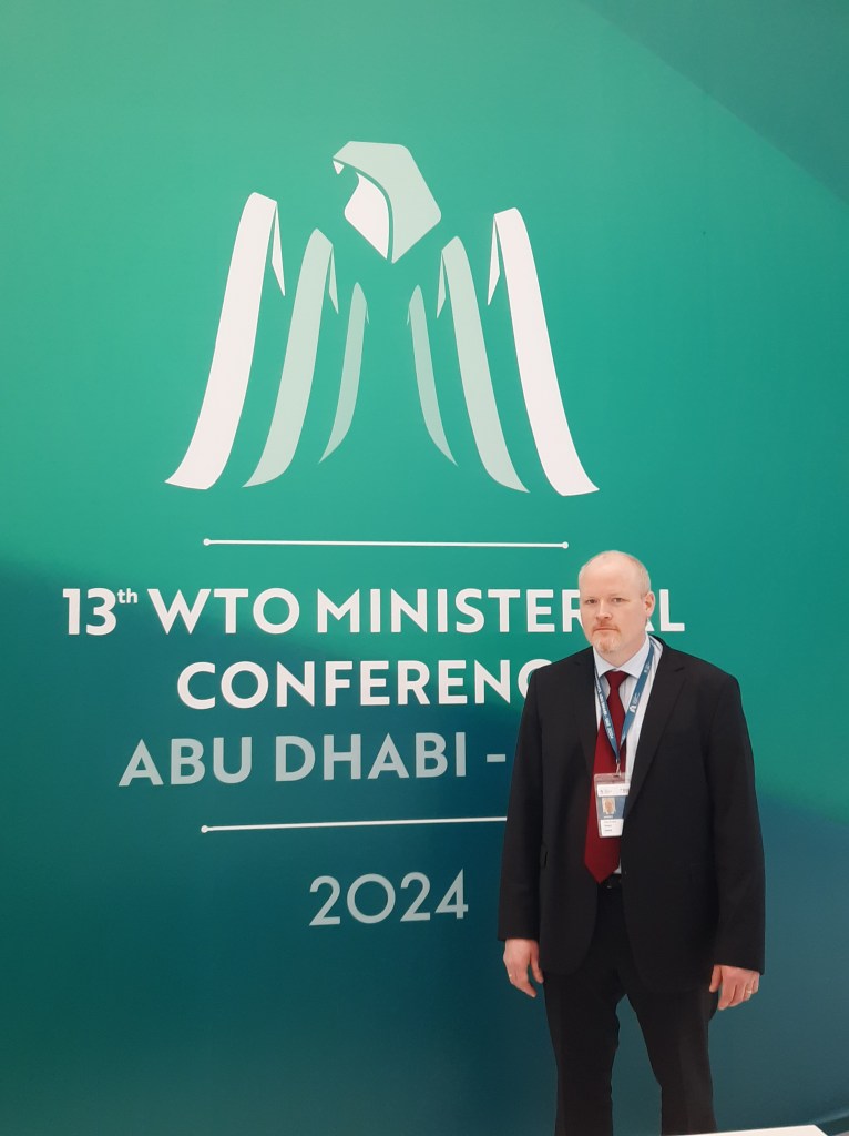 I månadsskiftet februari/mars i år hölls WTO:s 13:e ministerkonferens i Abu Dhabi i Förenade Arabemiraten. Ministerkonferensen är WTO:s högsta beslutande organ och sammanträder vartannat år i något WTO-medlemsland. Jag deltog på konferensen för Jordbruksverkets räkning och bevakade främst jordbruks- och fiskesubventionsfrågorna. Hela delegationen från Sverige bestod av ett tjugotal personer från regeringskansliet, myndigheter, riksdagen samt arbetsgivare och fackföreningar.