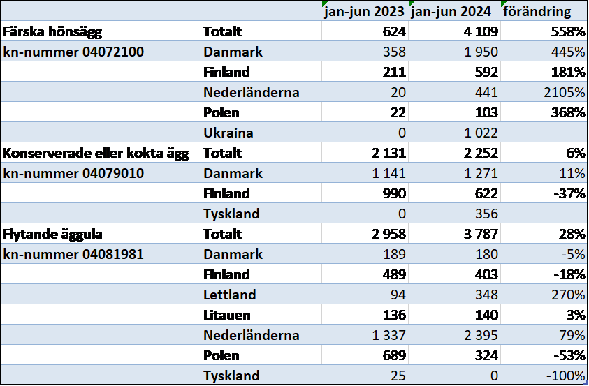 Jag börjar med äggmarknaden. När svensk äggnäring drabbades av fågelinfluensa 2021 minskade produktionen med cirka 14 procent. Under 2022 återhämtade sig äggproduktionen med råge och steg med nästan 21 procent. Förra året, alltså 2023, var det dags för nästa sjukdomsutbrott – den här gången salmonella. Vid båda dessa tillfällen har antalet värphöns i Sverige minskat med cirka 20 procent. Att vi ser en så pass stor minskning av äggproduktionen första halvåret 2024, trots att salmonellautbrottet inträffade 2023, beror på att det tar tid att sanera en stor anläggning och sätta in nya höns som börjar värpa. Utbrottet hade sin höjdpunkt på hösten 2023 och därmed var fortfarande många höns kvar i äggproduktion på det drabbade företaget under första halvåret 2023, som jag gör jämförelsen med. Sverige hade också ett begränsat utbrott av Newcastlesjuka hos värphöns våren 2024 som bidragit till att försämra utbudet av svenska ägg ytterligare innevarande år. Importen har stigit för att täcka upp för bristen på svenska ägg, det är en förhållandevis stor ökning med över 35 procent. I tabellen ser ni tre äggprodukter där importen ökat, uppgifterna är i ton. Jag konstaterar att ökningarna varit stora från traditionella handelspartners, som Danmark, Finland och Nederländerna, men att vi också haft ett nytt och omfattande importflöde av färska ägg direkt från Ukraina första halvåret 2024.