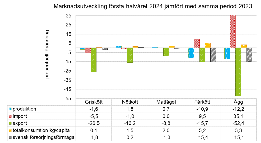 Jag konstaterar en varierande utveckling i de fem sektorer jag studerat. Störst variation jämfört med första halvåret 2023 syns i äggsektorn, men det finns en tydlig förklaring. Jag ser vidare två gemensamma riktningar och det är att exporten minskat samtidigt som konsumtionen ökat i alla fem sektorer. Den svenska försörjningsförmågan, alltså den andel av efterfrågan som hade kunnat tillgodoses av svenska produkter, har minskat för alla sektorer utom nötkött.